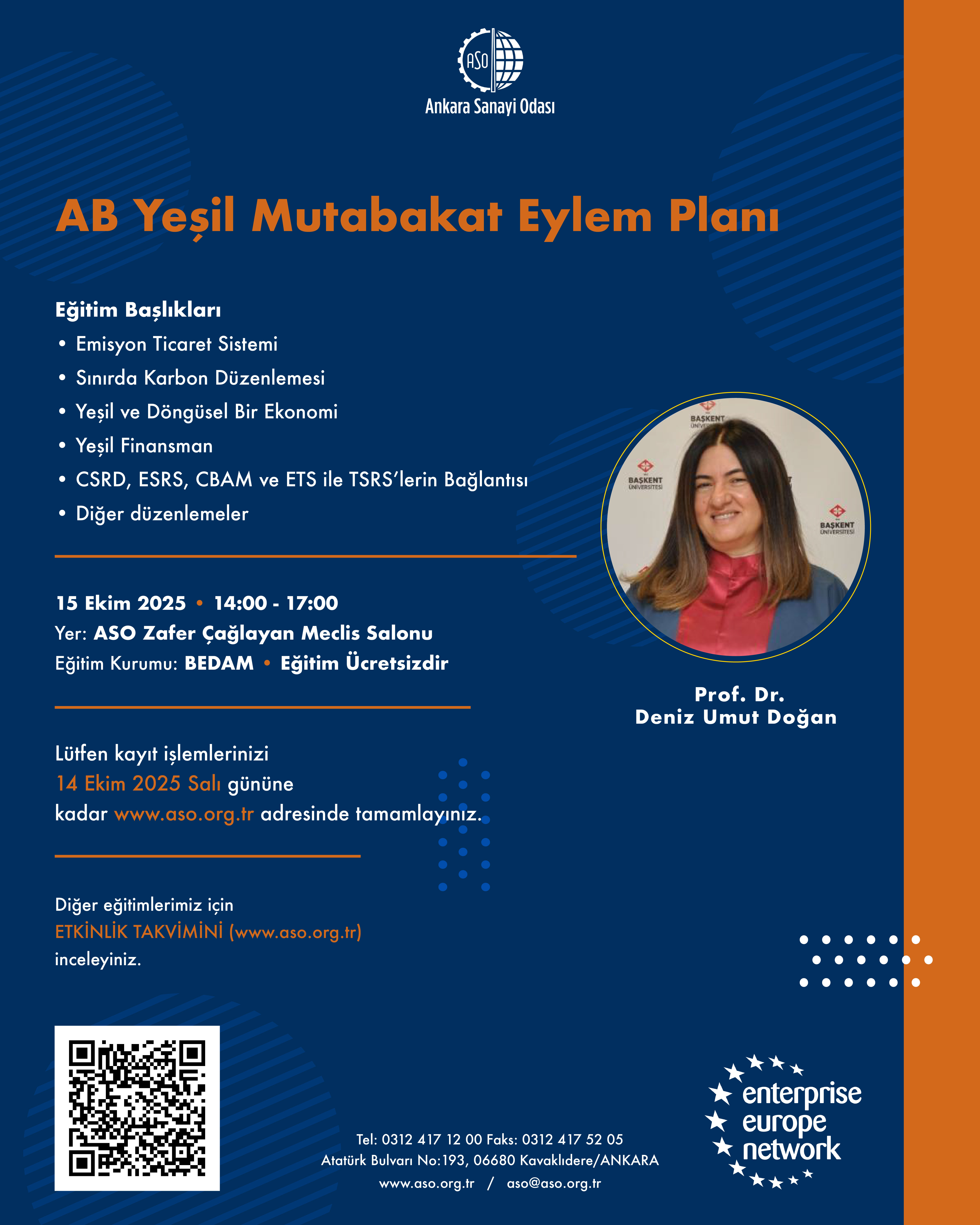 Ankara Sanayi Odası koordinasyonunda düzenlenecek olan "AB Yeşil Mutabakat Eylem Planı Eğitimi", Prof. Dr. Deniz Umut DOĞAN tarafından 15 Ekim 2025 Çarşamba günü saat 14.00 – 17.00 arasında ASO Zafer Çağlayan Meclis Salonu'nda gerçekleştirilecektir.