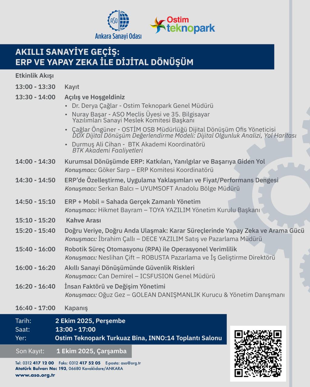 Ankara Sanayi Odası 35. Bilgisayar Yazılımları Sanayi Meslek Komitesi ile Ostim Teknopark iş birliğinde düzenlenen "Akıllı Sanayiye Geçiş: ERP ve Yapay Zeka ile Dijital Dönüşüm" başlıklı etkinlik, 2 Ekim 2025 Perşembe günü saat 13.00–17.00 arasında Ostim Teknopark Turkuaz Bina, INNO:14 Toplantı Salonu'nda gerçekleştirilecektir.