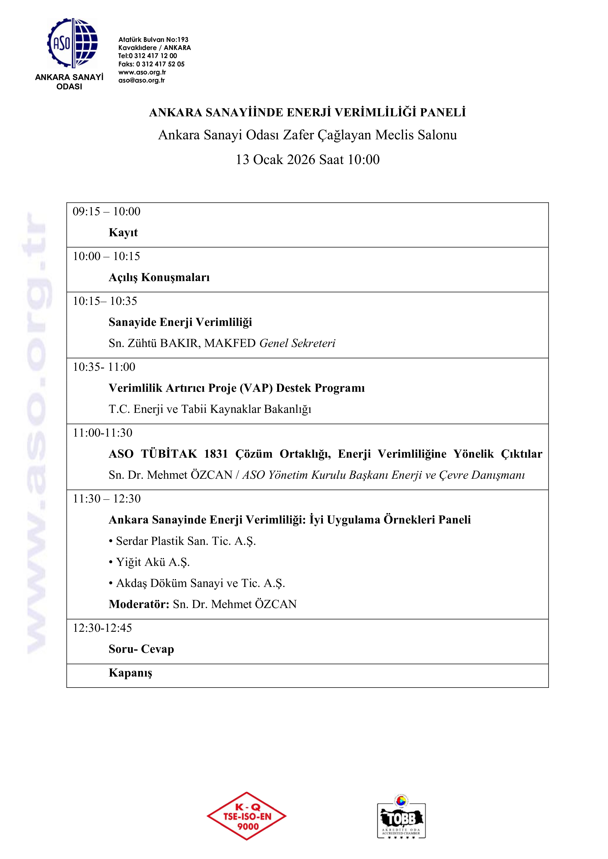 Programı ilişikte yer alan ücretsiz etkinliğe katılım sağlamak isteyen üyelerimizin 12 Ocak 2026 Pazartesi günü Saat:17:00'a kadar https://www.aso.org.tr/form/ankara-sanayiinde-enerji-verimliligi-paneli-348 adresi üzerinden kayıt yaptırabilecekleri hususunu bilgilerinize sunarız.