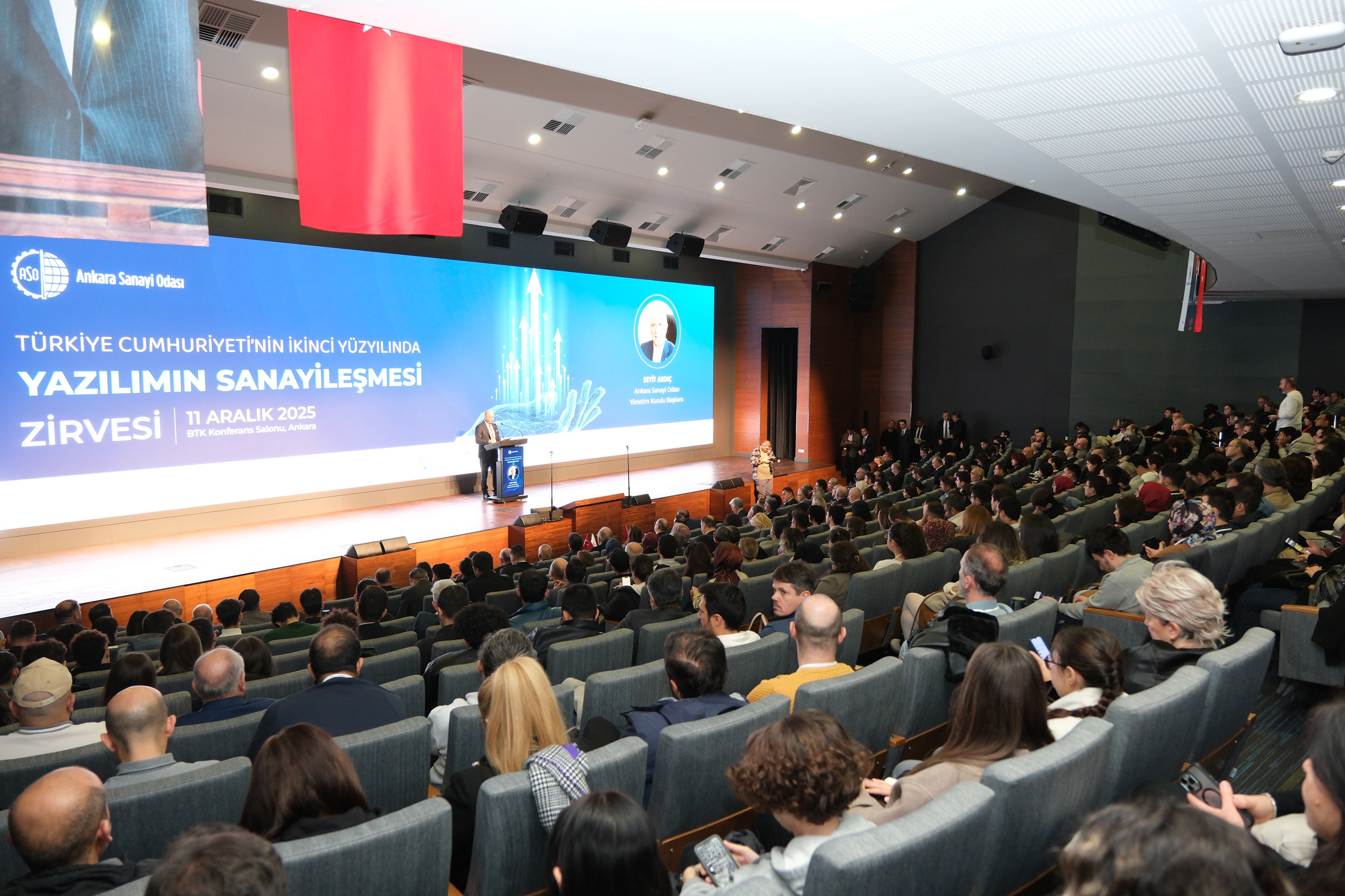 Ankara Sanayi Odası’nın düzenlediği “Türkiye Cumhuriyeti’nin İkinci Yüzyılında Yazılımın Sanayileşmesi Zirvesi”, TBMM Yapay Zeka Araştırma Komisyonu Başkanı, AK Parti Eskişehir Milletvekili Fatih Dönmez, Ulaştırma ve Alt Yapı Bakan Yardımcısı Ömer Fatih Sayan, Bilgi Teknolojileri ve İletişim Kurumu (BTK) Başkanı Ömer Abdullah Karagözoğlu ve sektör paydaşlarını bir araya getirdi. ASO Bilgisayar Yazılım Sanayi Meslek Komitesi’nin koordinasyonunda, BTK Konferans Salonu’nda gerçekleşen zirvede yazılım sektörü tüm yönleriyle ele alındı. Zirvenin açılış konuşmasını yapan ASO Başkanı Seyit Ardıç, sanayide rekabetin, giderek makineye yatırım yapan ile koda, veriye ve ürüne yatırım yapan arasındaki farkla belirlendiğini vurgulayarak, “Sanayisiz kalkınma olmaz, ama artık yazılımsız sanayi de olmaz” dedi.