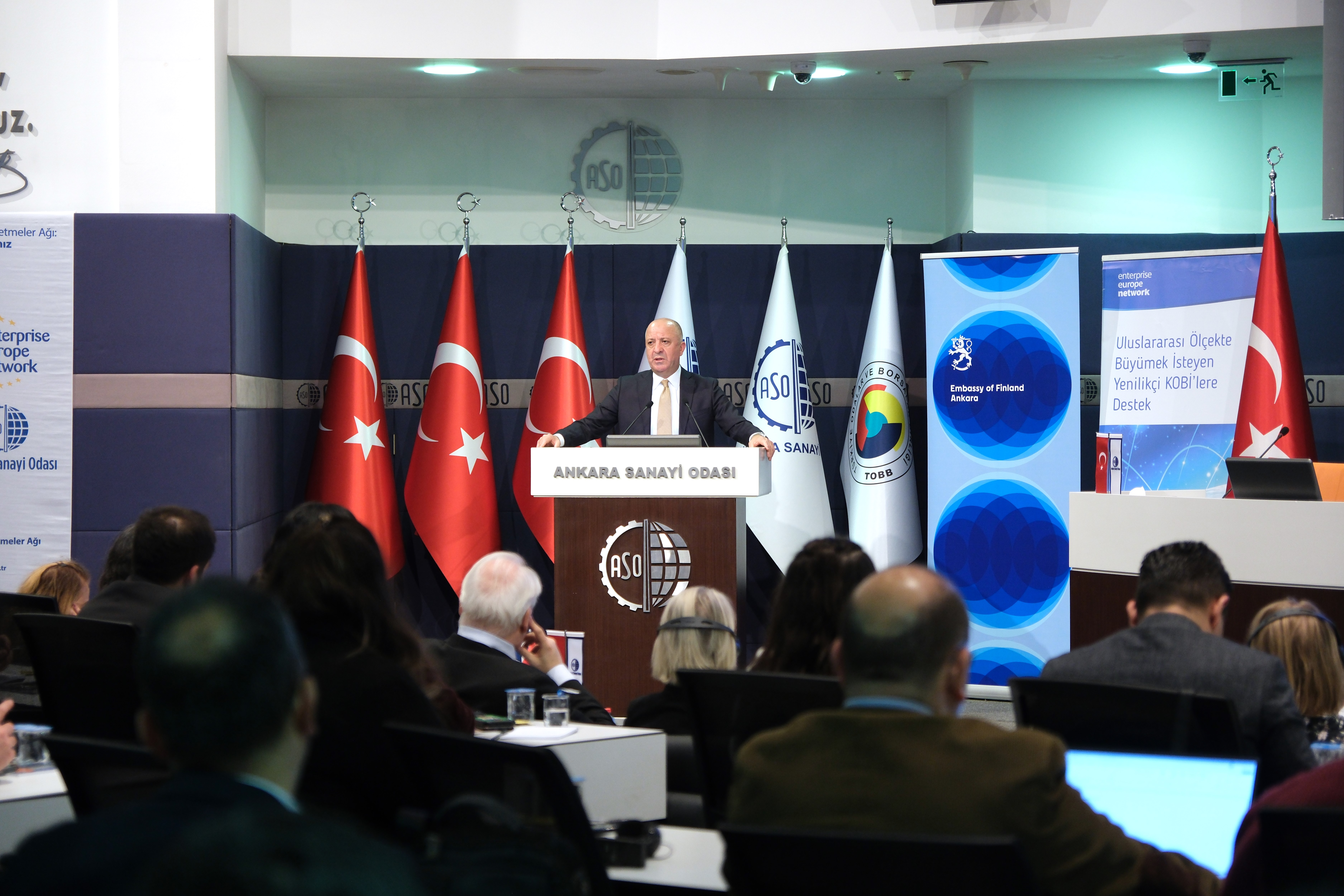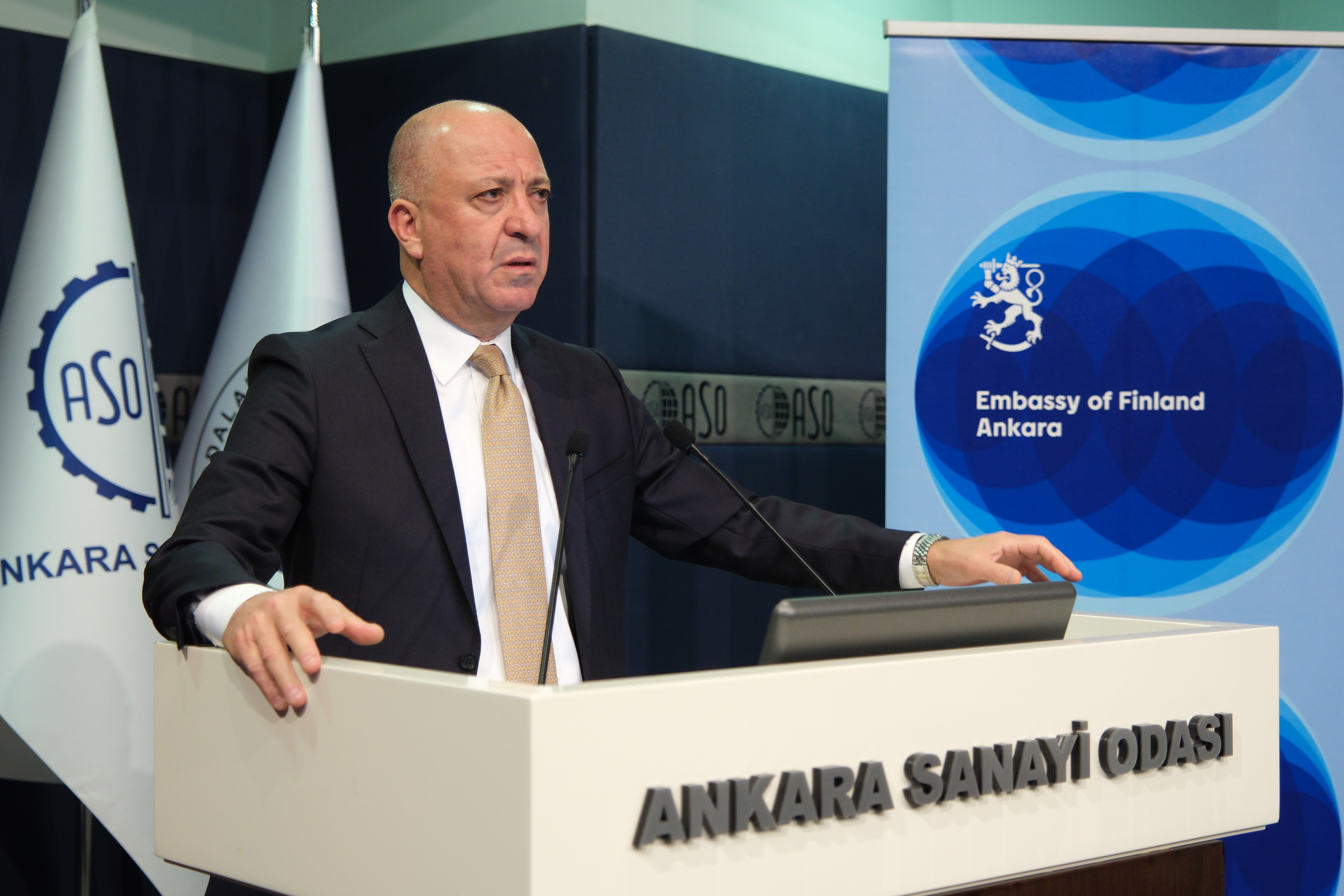 Ankara Sanayi Odası (ASO) ile Finlandiya Cumhuriyeti Ankara Büyükelçiliği iş birliğinde düzenlenen “Finlandiya Ülke Günü” etkinliği, ASO Zafer Çağlayan Meclis Salonu’nda gerçekleştirildi. İki ülke arasındaki sanayi, ticaret ve yatırım fırsatlarının değerlendirildiği toplantının açılışında konuşan ASO Başkanı Seyit Ardıç, “Üçüncü ülkelerde gerçekleştirilecek altyapı, enerji ve madencilik projelerinde Türk–Fin ortaklığı hem finansman hem teknoloji hem de uygulama gücü açısından son derece tamamlayıcıdır” dedi.