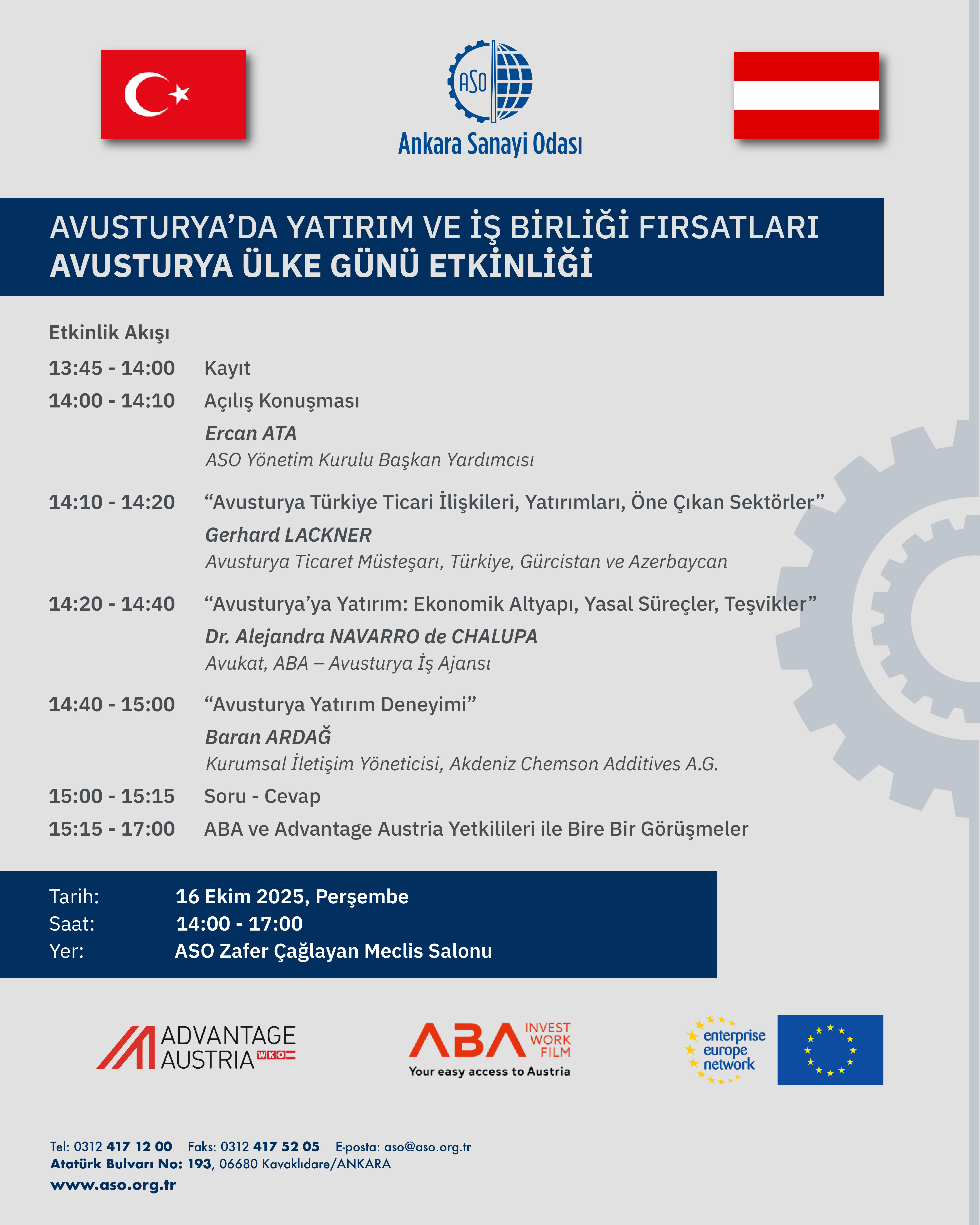 Odamız ve Avusturya Ankara Büyükelçiliği Ticaret Müşavirliği Advantage Austria Türkiye, Georgia & Azerbaijan iş birliğinde, Avusturya Federal Ekonomi ve Avusturya Çalışma Bakanlığı'na bağlı ABA (Austria Business Agency) Avusturya İş Ajansı'nın katılımlarıyla 16 Ekim 2025 Perşembe günü 14:00 – 17:00 saatleri arasında Ankara Sanayi Odası Zafer Çağlayan Meclis Salonunda "Avusturya'da Yatırım ve İş Birliği Fırsatları" temalı Avusturya Ülke Günü etkinliği düzenlenecektir.