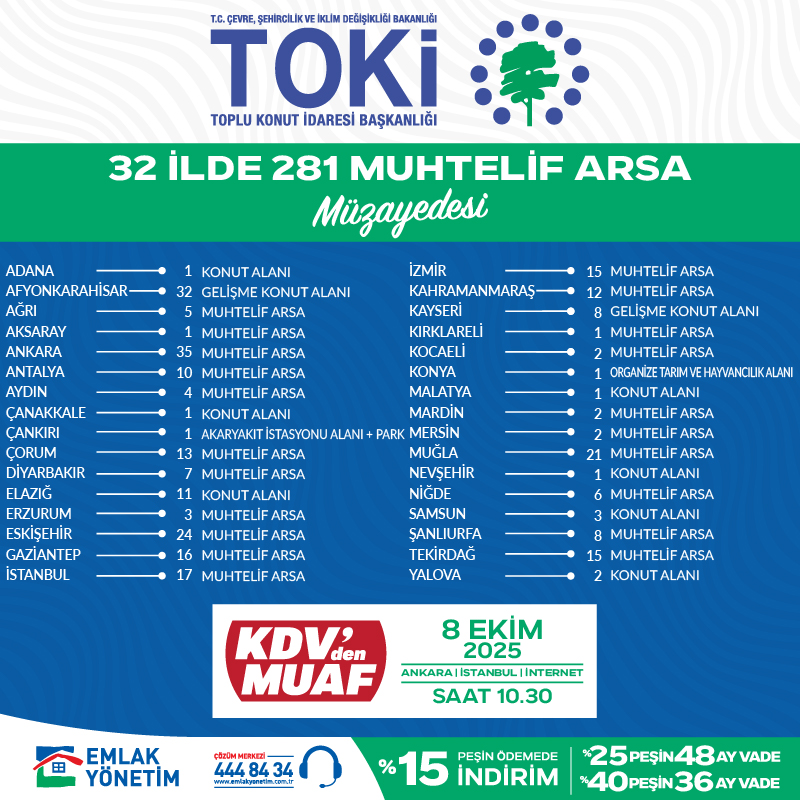 Satış, şart ve zamanı Türkiye genelinde yayın yapan 6 adet gazetede ilan edildiği belirtilen, satış şartnamesi ve lotlu listesi ekte yer alan söz konusu arsaların 8 Ekim 2025 saat 10:30' da teklif alımına sunulacağı ve açık artırmaya salonlardan ya da internet üzerinden katılım sağlanabileceği hususunu bilgilerinize sunarız.