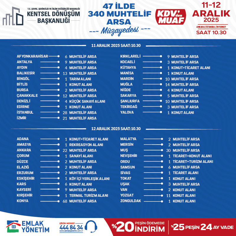 Satış, şart ve zamanı Türkiye genelinde yayın yapan 5 adet gazetede ilan edildiği belirtilen, satış şartnamesi ve lotlu listesi ekte yer alan söz konusu arsaların 11-12 Aralık 2025 saat 10:30' da teklif alımına sunulacağı ve açık artırmaya salonlardan ya da internet üzerinden katılım sağlanabileceği hususunu bilgilerinize sunarız.