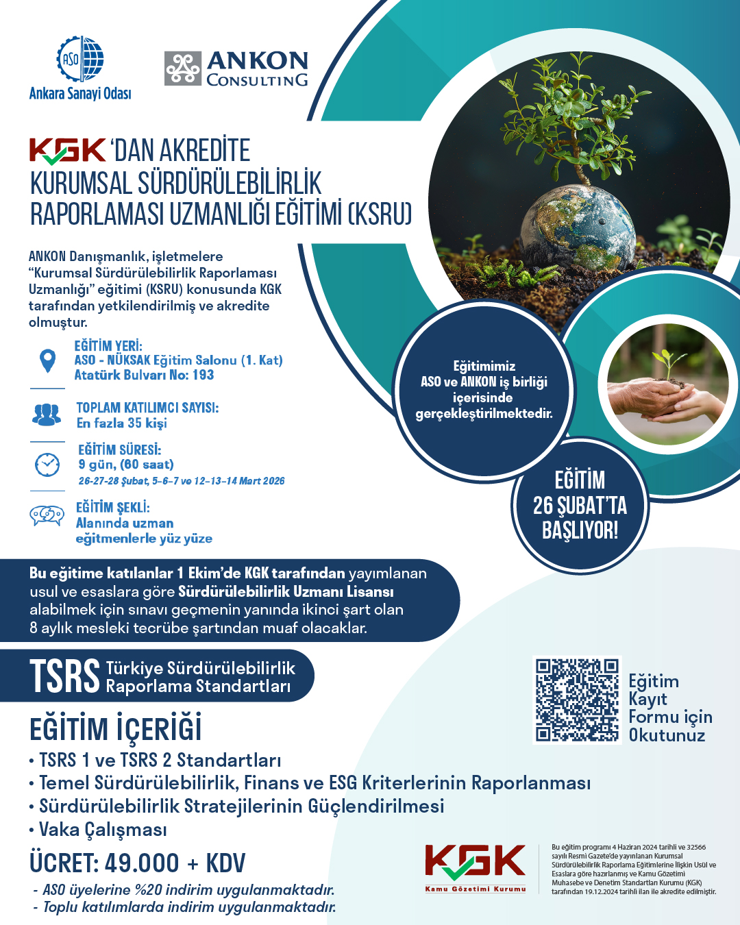 Bu kapsamda, Kamu Gözetimi Kurumu (KGK) tarafından akredite Ankon Danışmanlık ve Odamız işbirliğinde 26-27-28 Şubat, 5-6-7-12-13-14 Mart 2026 tarihlerinde haftada 3 tam gün olmak üzere 3 hafta süresince toplam 60 saat "Kurumsal Sürdürülebilirlik Raporlaması Uzmanlığı Eğitimi" düzenlenecektir.