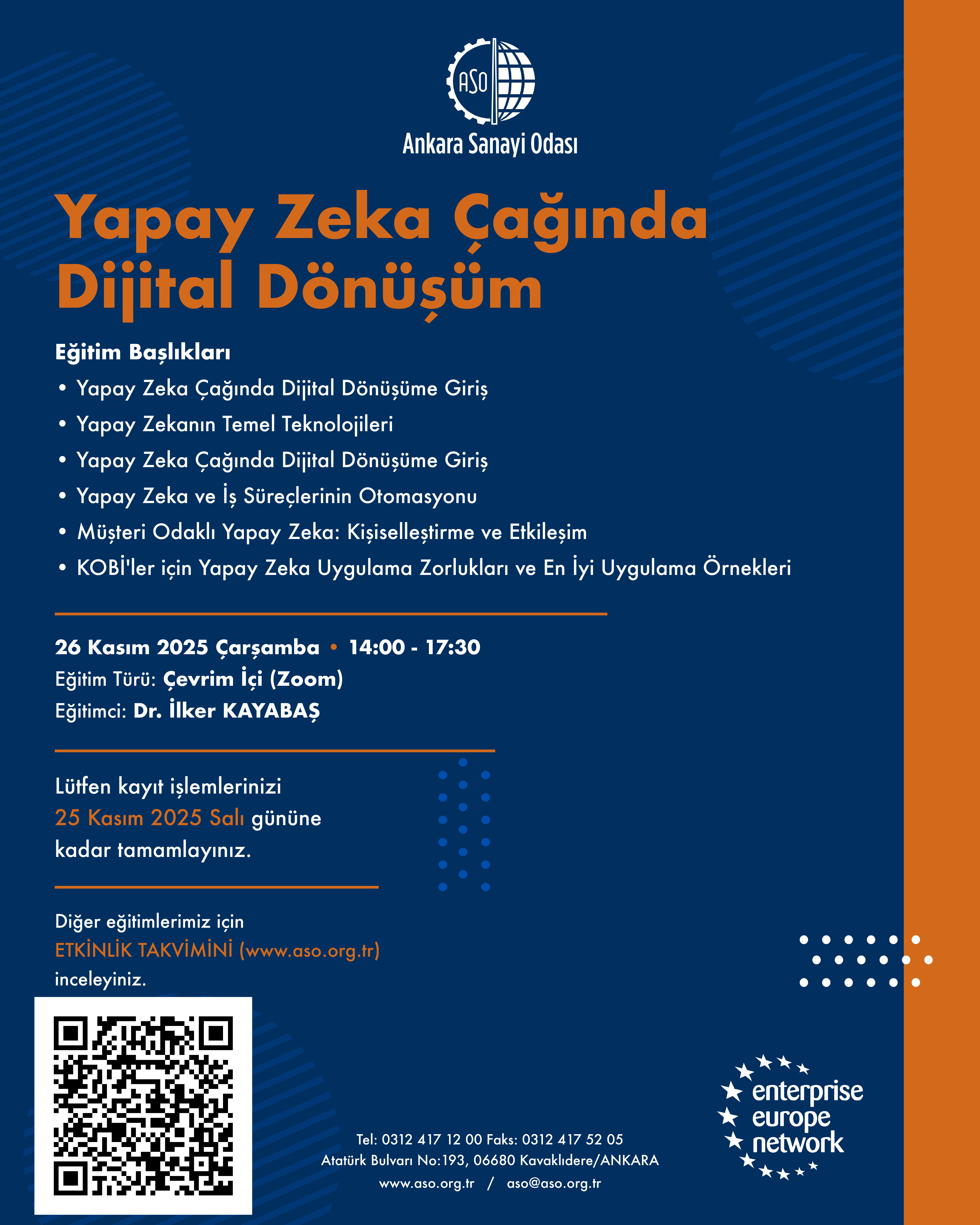 Ankara Sanayi Odası koordinasyonunda 26 Kasım 2025 Çarşamba günü saat 14.00 – 17.30 arasında Sn. Dr. İlker KAYABAŞ tarafından çevrim içi olarak "Yapay Zeka Çağında Dijital Dönüşüm" konulu eğitim gerçekleştirilecektir.
