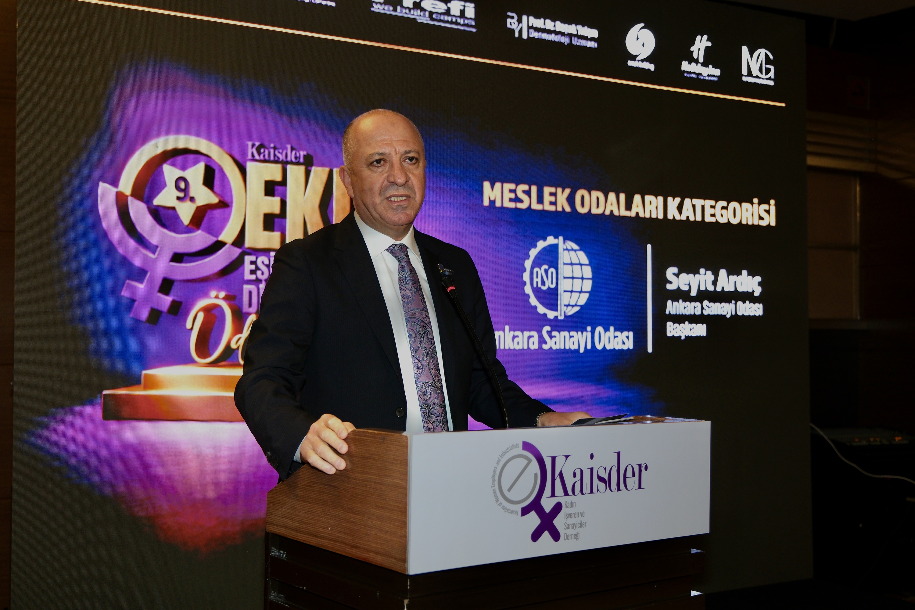 Ankara Sanayi Odası; Kadın İşveren ve Sanayiciler Derneği (KAİSDER) tarafından düzenlenen EKD Ödülleri kapsamında “Eşitlik Kültürüne Duyarlı İş Yeri Ödülü’nü aldı. ASO Başkanı Seyit Ardıç, “Kadınların potansiyelini yeterince kullanamayan hiçbir toplum, güçlü ve sürdürülebilir bir kalkınma sağlayamaz” dedi.