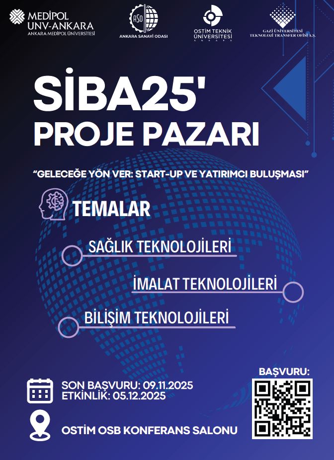 Ankara Medipol Üniversitesi'nin düzenleyici kuruluş olduğu, OSTİM Teknik Üniversitesi, Gazi TTO A.Ş. ve Odamız iş birliğiyle "SİBA25' Proje Pazarı (Sağlık, İmalat ve Bilişim Alanlarında Proje Pazarı)" etkinliği gerçekleştirilecektir.