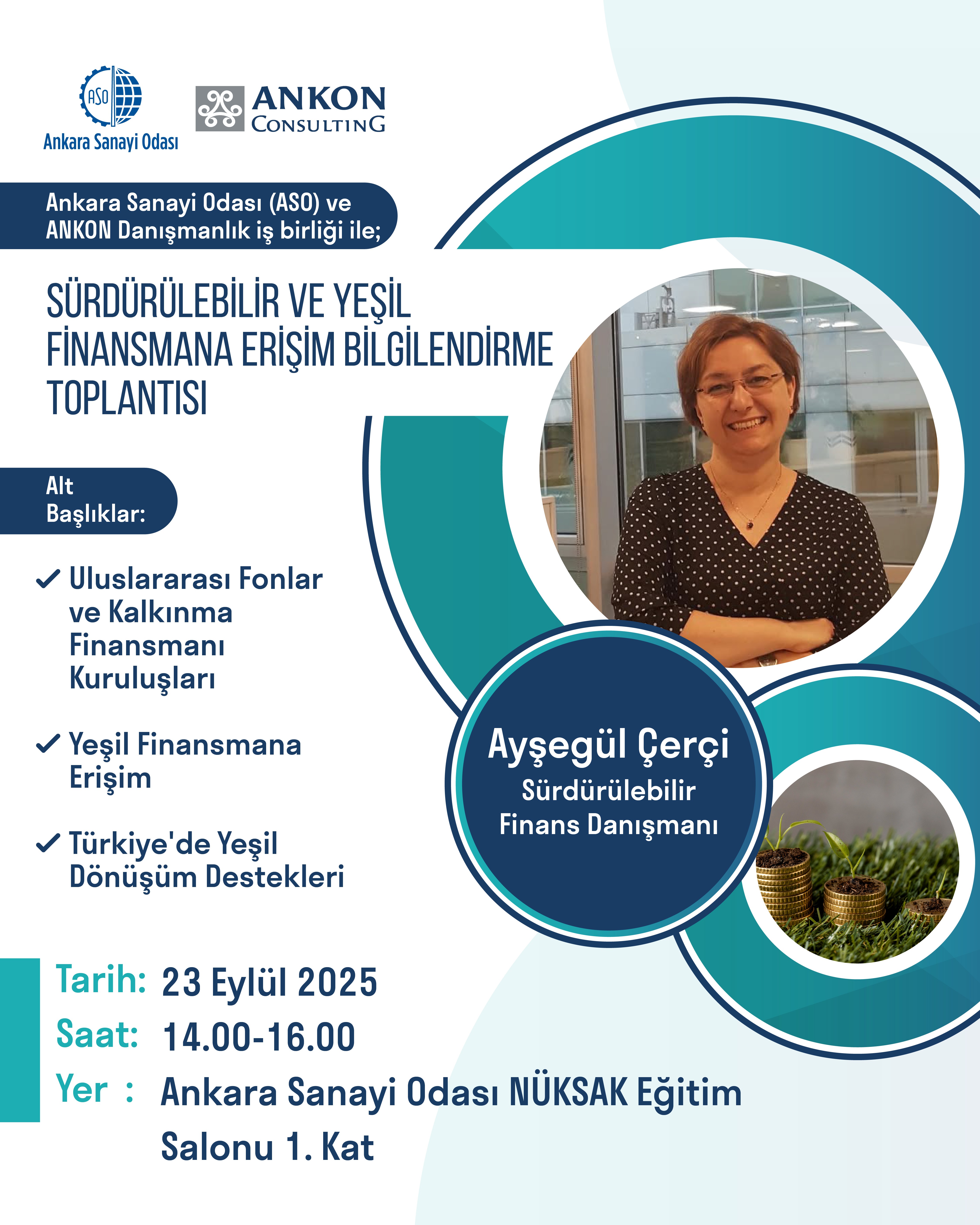 Ankon Danışmanlık ve Ankara Sanayi Odası işbirliğinde 23 Eylül 2025 Salı günü 14:00-16:00 saatleri arasında ekte yer alan program çerçevesinde, ASO NÜKSAK Eğitim Salonunda "Sürdürülebilir ve Yeşil Finansmana Erişim" bilgilendirme toplantısı gerçekleştirilecektir.