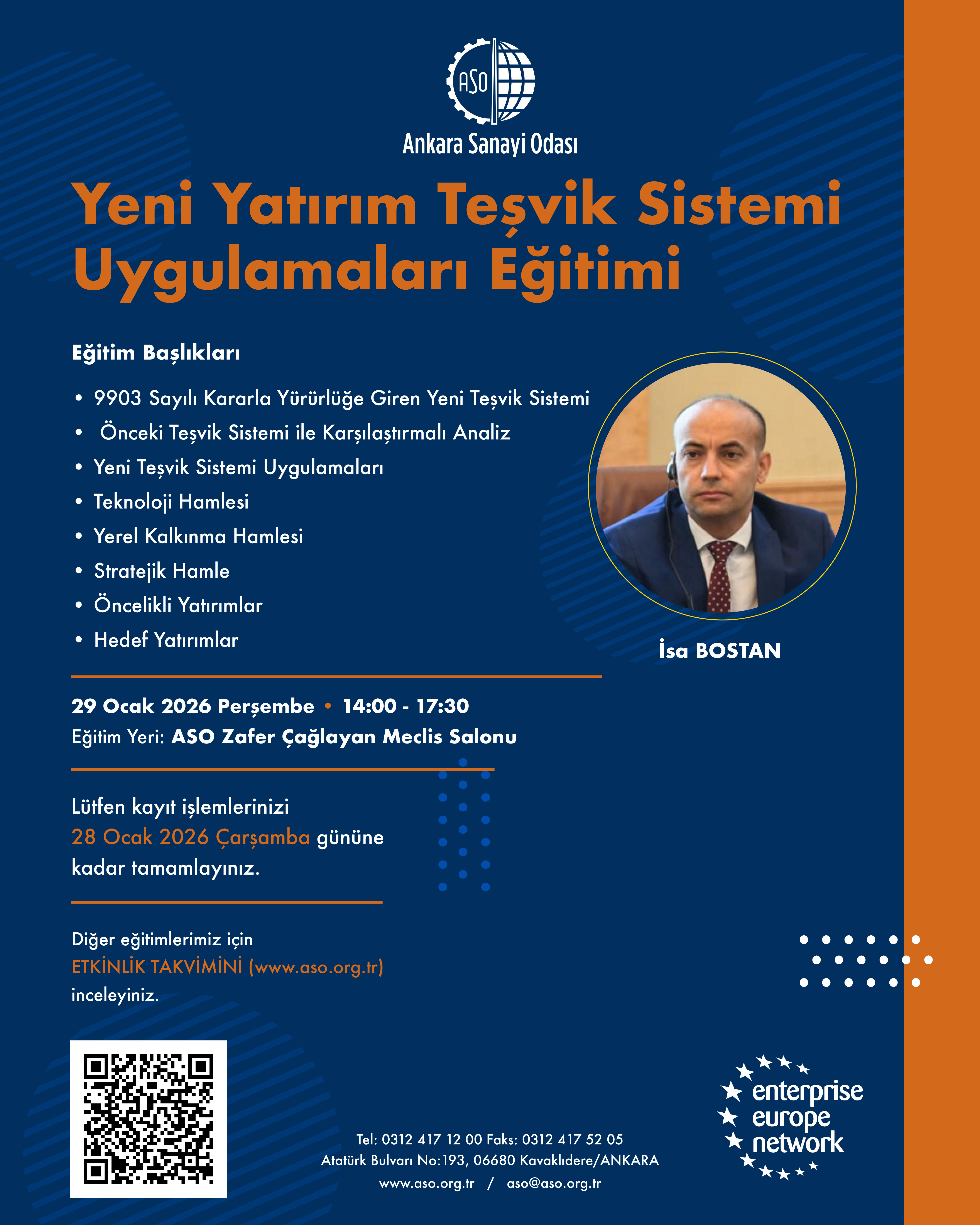 Ankara Sanayi Odası koordinasyonunda düzenlenecek olan "Yeni Yatırım Teşvik Sistemi Uygulamaları Eğitimi", Sn. İsa Bostan tarafından 29 Ocak 2026 Perşembe günü 14.00 – 17.00 saatleri arasında ASO Zafer Çağlayan Meclis Salonu'nda gerçekleştirilecektir.